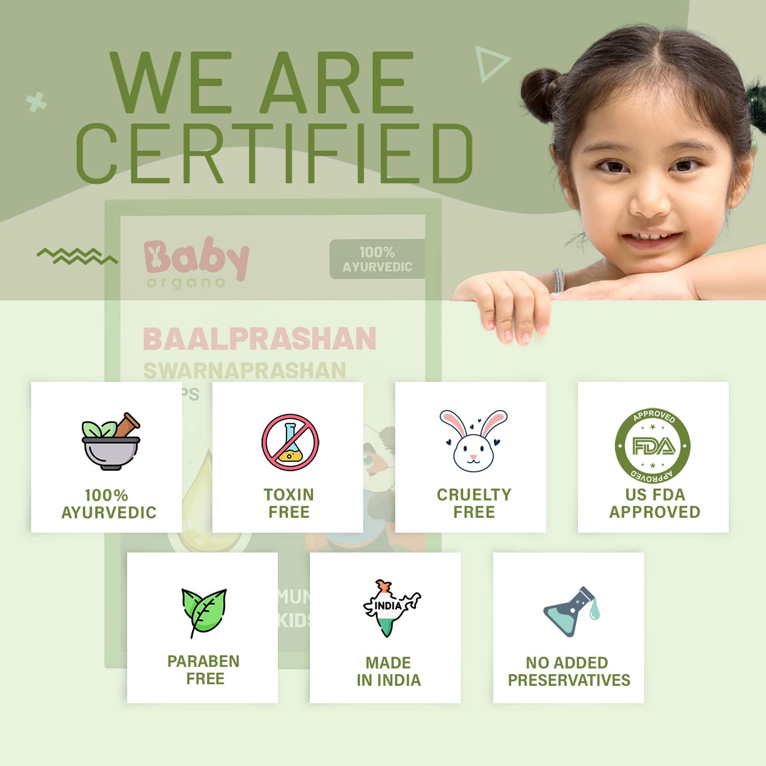 Baalprashan Swarnaprashan/Suvarnaprashan Drops, a potent 100% Ayurvedic immunity booster designed specifically for kids. Trusted by 1 million+ parents, Baalprashan Swarnaprashan Drops contain Shankhpushpi (butterfly pea flower), Brahmi, and Vacha for holistic mental development. What makes Baalprashan Swarnaprashan truly special is the inclusion of 24-carat Gold Ash, which enhances its effectiveness and strength as a natural immunity booster for children.