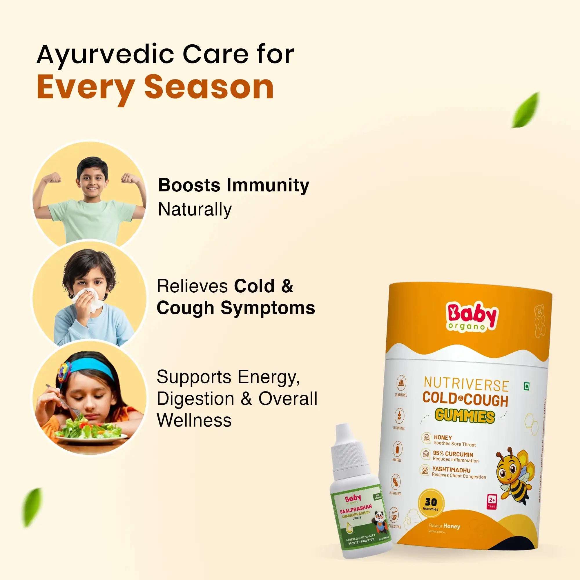 Daily Immunity & Cold Relief Combo for Kids| Baalprashan Suvarnaprashan Drops (15ml) + Nutriverse Cold Care Gummies (30 Gummies/Pack)