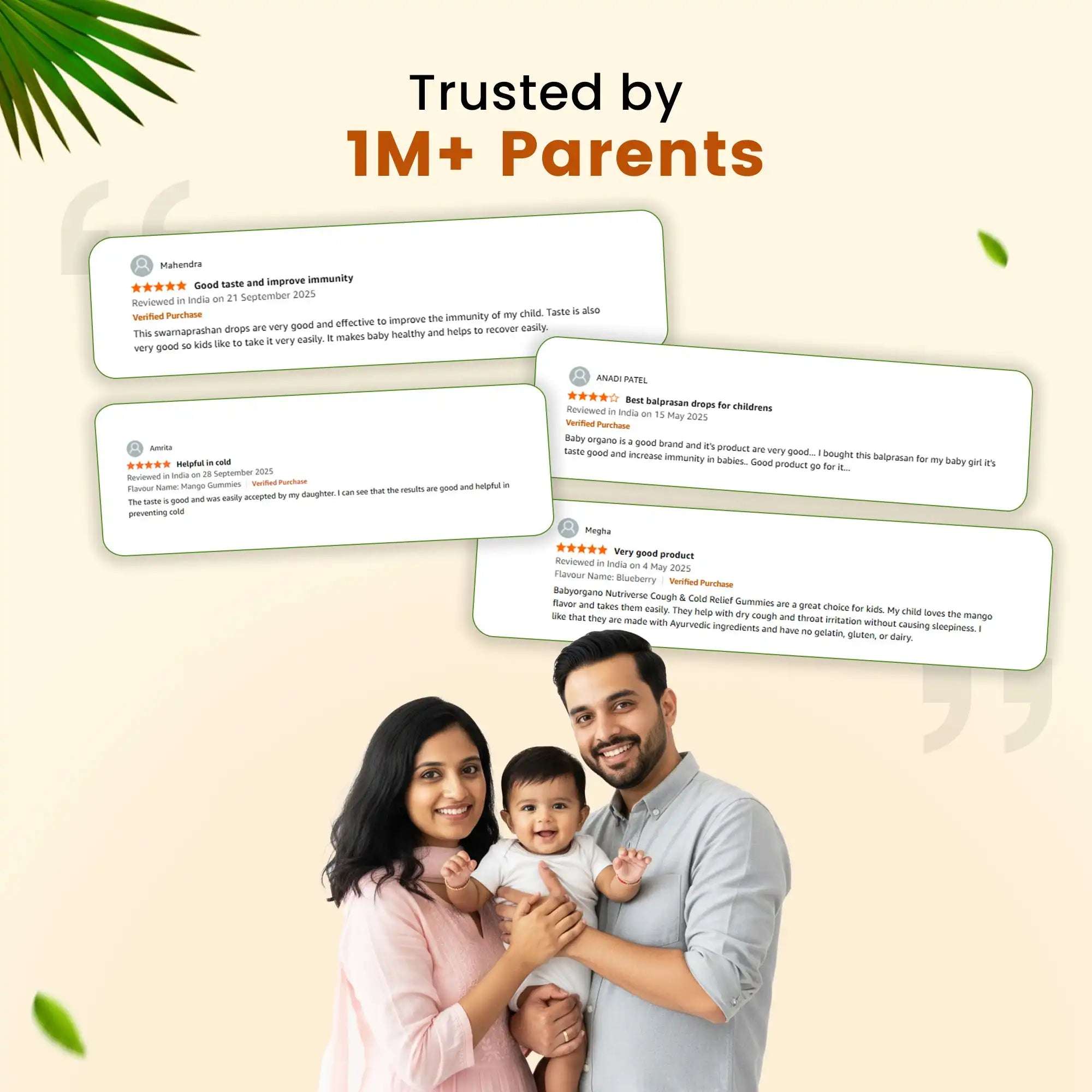 Baalprashan Swarnaprashan Drops are trusted by over 1 million parents as a daily immunity booster for kids aged 0 to 15 years. Made with 24-carat Gold Ash (Swarna Bhasma), Shankhpushpi, Brahmi, and Vacha, these drops support growth, improve digestion, and enhance natural defenses, all while staying 100% natural.