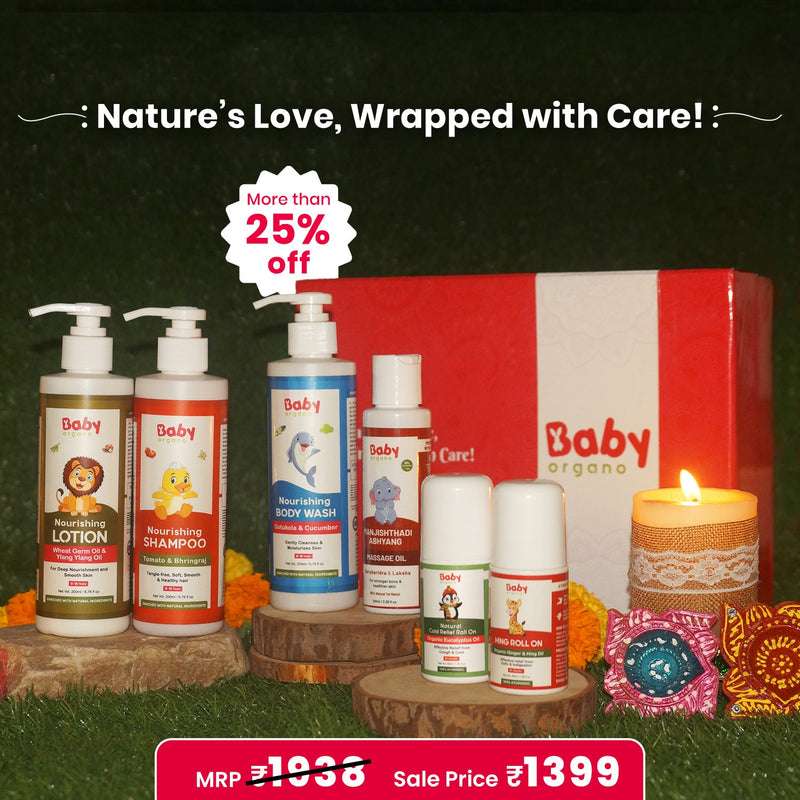 Finding a perfect gift for baby showers, newborns’ birthdays, or festivals just got easy with our Little Guardian Essentials gift hamper. Crafted with love, this gift set offers Ayurvedic goodness for a baby’s delicate skin, body, and overall wellness. This hamper has our bathing essentials, massage oil, cold relief roll on, and hing roll on - all these products will help new parents establish a healthy daily routine for their babies. A perfect blend of love, care, and wellness comes hidden for the little ones in this amazing festive gift pack.