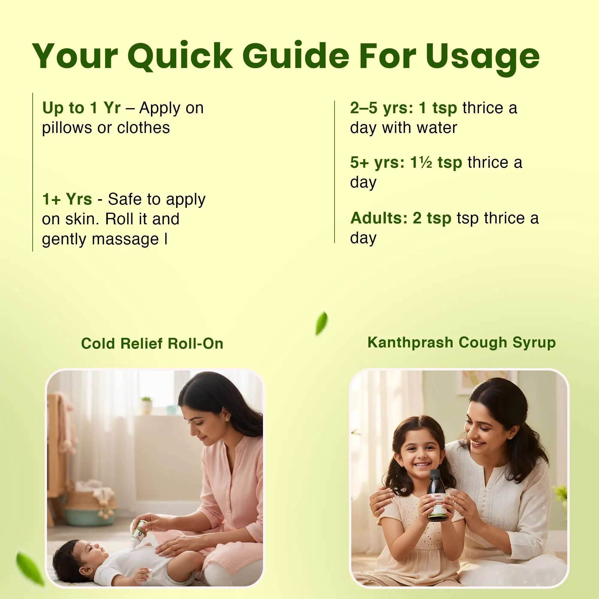 Our Ayurvedic Cold Relief Roll-On offers quick comfort from blocked noses, chest congestion, and sore throats. Powered by essential oils like Eucalyptus, Tulsi, Peppermint, Chamomile, Wintergreen, and Lavender, it provides effective relief, helping kids breathe easier and sleep better, especially at night.